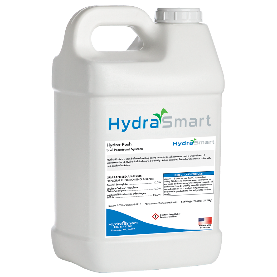 Hydra-Push combines dual mode surfactants, acids, calcium, and HydraSmart’s nutrient efficiency polymer to improve water movement through hydrophobic soils and across the root zone. It effectively flushes bicarbonates and sodium, enhancing soil performance and water distribution—an ideal, cost-effective surfactant solution for push-up greens and fairway injections.